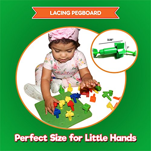 THE BENEFITS are endless! This pegboard for kids educational learning shapes toy is great for toddlers, preschoolers, kindergartners, occupational therapy clients and even elderly patients who need to strengthen their fine motor skills. This interactive lacing shapes activity peg board stacker also helps to improve memory skills, hand eye coordination and strengthens those cognitive muscles.
