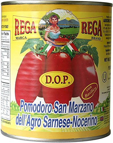 Rega Brand true Italian San Marzano Tomatoes, DOP Certified. Whole tomatoes with basil. Imported from Italy. The AGRICONSERVE REGA Soc. Coop. Agr. canned food company with offices and plant in Striano (NAPLES) Italy, was born in the 1987 with "STRIANESE" and "REGA" brand, following the long experience since 1965. After all of these years accumulated in the fields, through their ancestors, that were farmers, they were suppliers of fresh San Marzano tomatoes to the canned tomatoes industries in the Sarnese Nocerino Area The Rega family decided to start tomato manufacturing and the first tomatoes they packed were the SAN MARZANO. By Rega family standards, only the tomatoes from this small plot of land named Sarnese Nocerino Area, were the best ones; the reasons are linked to the vicinity of the foot of Vesuvius, which in the last eruption conferred to the lands an extraordinary fertility; to the climate and to the several small sources of pure water; these sources born from the Sarno Valley and the basin of Lavorate; it goes across the whole area and the farmers use that water to irrigate the lands. All of these reasons, make this part of the Campania Region the natural habitat for a supreme quality of San Marzano tomato DOP. Right in this oasis of fertility is where the Rega's established, in 1999, a new modern industrial complex that extends to an area of around 30.000 square meters. They make use of this modern structure with full respect of the environment. They also have a modern laboratory composed of highly specialized people that insure the highest standards in quality. The San Marzano tomatoes DOP (denomination of protected origin) was recognized by the European Union in the 1996; only 41 communes, all in the Campania Region, were recognized. These are the only possible regions to cultivate the DOP San Marzano Tomato.Precisely in the provinces of Naples - Salerno and Avellino.