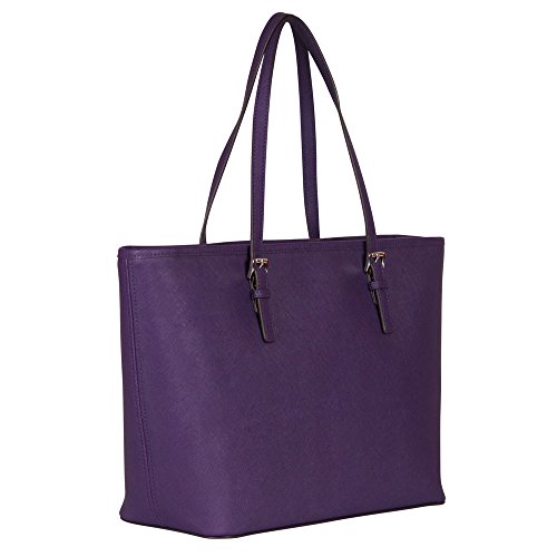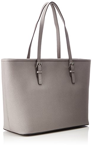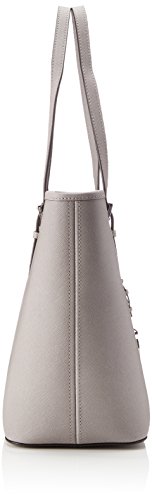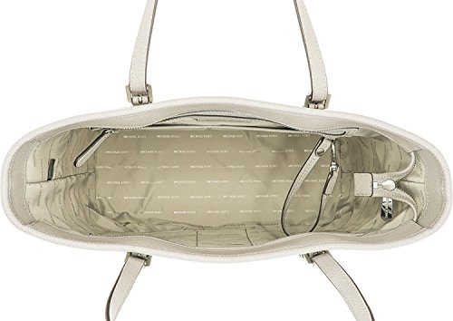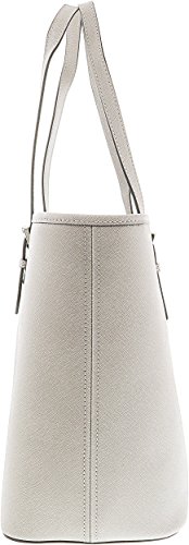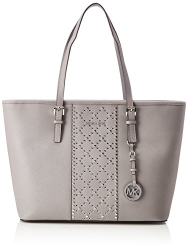 Studio : Michael Kors Publisher : Michael Kors Product Description This MICHAEL Michael Kors Jet Set Travel Top Zip Tote is made of Saffiano Leather and Silver hardware, with stud and grommet detail, and a Silver MK Logo Medallion that hangs from a D-ring on the front. This Tote features adjustable, double flat leather handles, a recessed top zip closure, the back wall has a zip pocket, two slip pockets, and a key leash, and the front wall has six slip pockets. 0