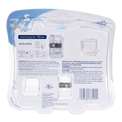 ReleaseDate : 2015-12-19 Studio : SC JOHNSON Publisher : SC JOHNSON Binding : Health and Beauty Product Description Continuous fragrance for any size room is just an outlet away with Glade PlugIns Scented Oils. With each fragrance refill lasting up to 30 days, simply plug in the warmer for long-lasting fragrance that's adjustable to fill any room in your home with your favorite Glade fragrances. This 2pk of oil warmers offers a great value and gives multiple air freshener options throughout the home. 0