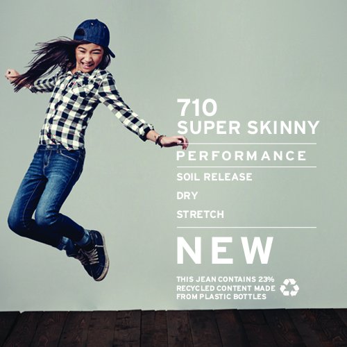 Levi's 710 performance jean offers a super skinny fit from hip to ankle, and features our signature 5-pocket design with arcuate stitch on the rear spade pockets. Engineered from stretch denim and 23 percent recycled plastic bottles, this jean keeps her moving all day long and is eco-friendly too. Wash away stains easier than ever with new soil release technology, while moisture wicking fabric keeps her comfortably dry.Feature