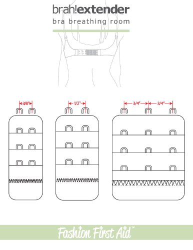 Brah. Extenders simply make life a little more comfortable. Whether you're in-between sizes or experiencing maternity weight gain, bra extenders give you the breathing room you need to tackle life's other challenges. They simply attach to the hooks on your bra band, providing you a little more breathing room and extending the life of your favorite bra. Ultra thin, soft microfiber with nylon-coated hooks. The measurement between hooks (i.e. from center of hook to center of next hook- see size chart image) is 3/8 inch on the 2-hook NARROW, 1/2 inch on the 2-hook and 3/4 inch on the 3-hook. Using Brah. Extenders is as easy as - Hook the hook part of the bra extender onto the eye part of your bra. Put on your bra as you normally do. Breathe a sigh of relief that your bra-blem is solved. Contains - 3 bra extenders. Color - One each black, white, beige. Material - Soft microfiber with nylon coated hooks. 2-hook measures - 2.6 x 1.1 x .08 inch (66 x 31 x .2 mm)Feature