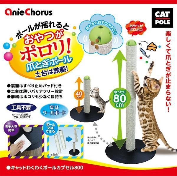 | カプセルにおもちゃやおやつを入れるとポールが揺れてポロリ!楽しくて、爪とぎが止まりません。鉄製の土台は臭わず清潔でお手入れも楽々で頑丈。しかも夏はひんやりボードに! |