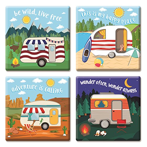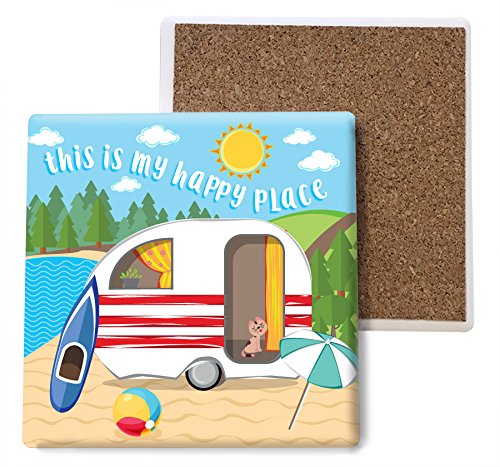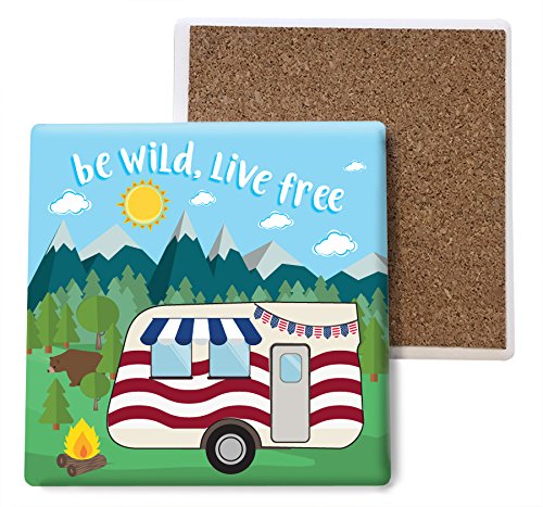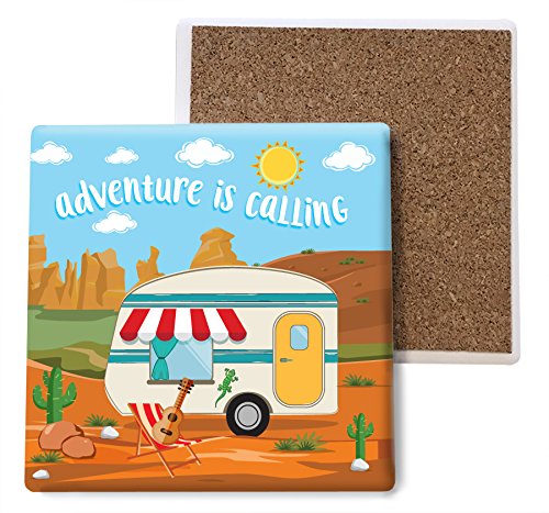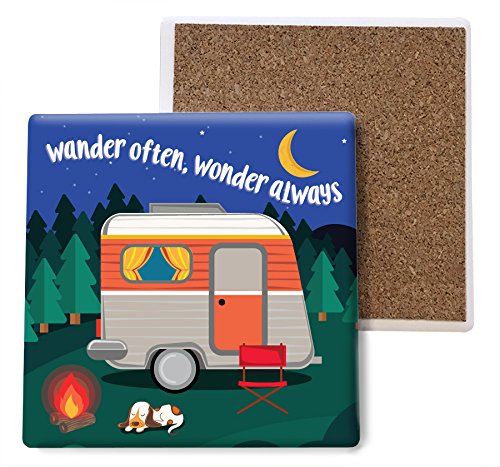 -. Feature : Set of four decorative camping themed stone coaster set / Designs include Americana wilderness, beach summer fun, stone desert, and nighttime forest / Cork backed to protect surfaces; great for hot or cold drinks / Coasters measures 4 by 4 inches square; set comes in a box ready for gift giving / These practical and decorative coasters are perfect for the camping enthusiast!