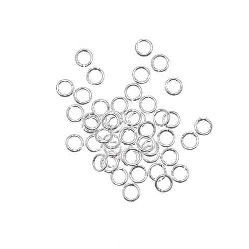 These handy, open silver plated jump rings are great as the female half of small clasps, hooks & other fasteners. Use to fasten the male half to your chain. Measurements: 4mm outer diameter. Wire is 20 gauge, or .032 Quantity: 50 open jump rings.Feature