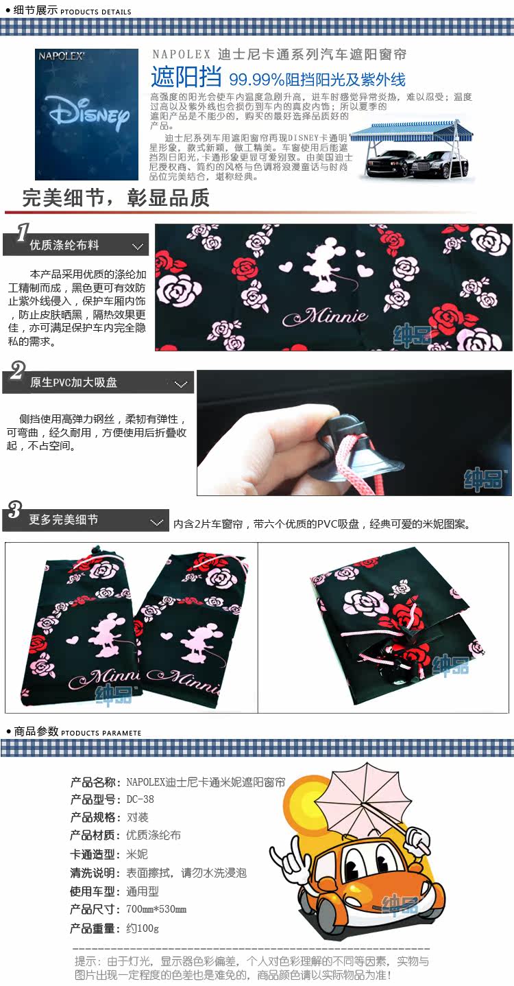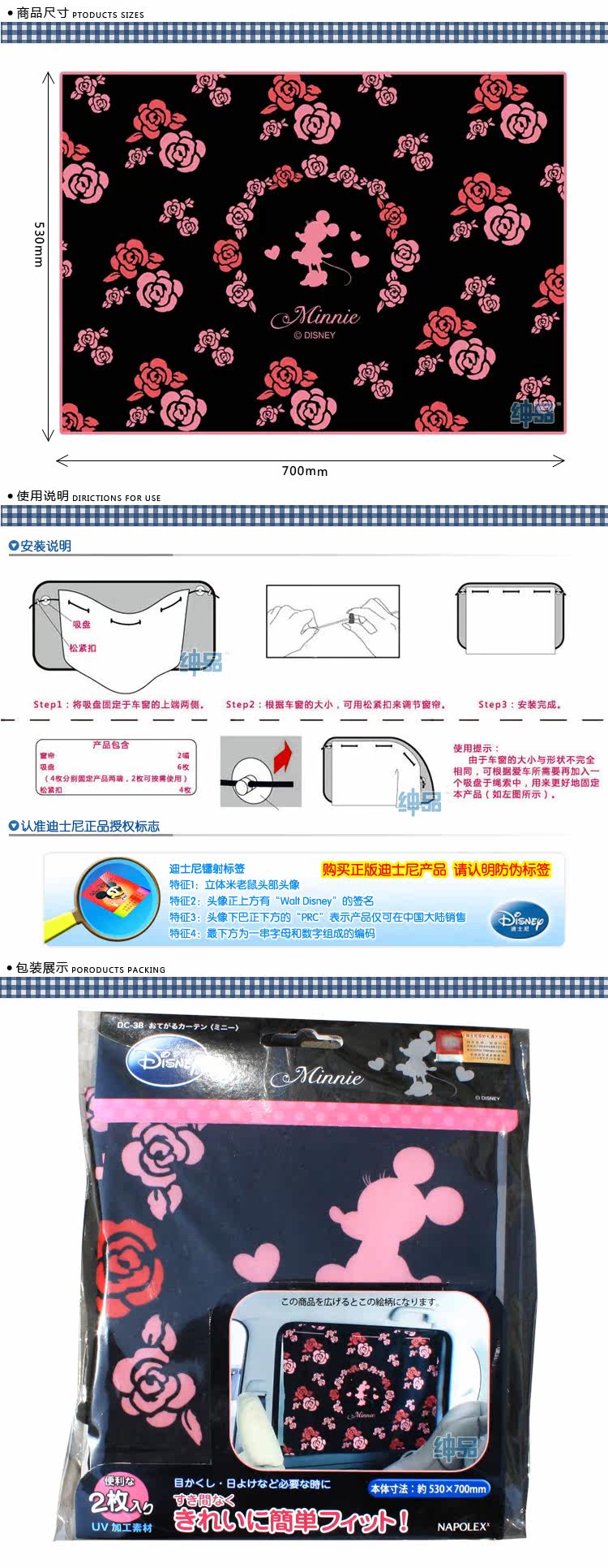 NAPOLEX迪士尼米妮公主系列车用遮阳窗帘再现DISNEY卡通明星形象,款式新颖,做工精美,更显可爱别致。车窗使用后能遮挡烈日阳光,卡通形象 更显可爱别致。由美国迪士尼授权商NAPOLEX设计师设计和授权生产,简约的风格与色调将浪漫童话与时尚品位完美结合,堪称经典。带防伪商标,做 工精,全球同步销售,是不可多得的精品。