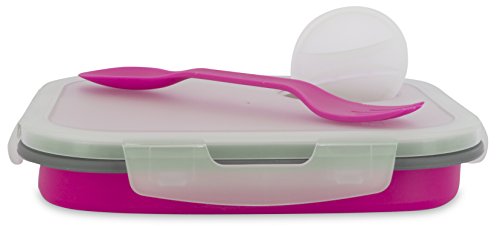 Makes lunch better than ever! Silicone Base is Microwave and Dishwasher Safe. Lid is not Microwave or Dishwasher Safe. Expands to Double the size, push down to collapse and store at half the size. Has 1 inner compartment. Includes a condiment lid and a reusable spark utensil that stores in the lid! Available in 4 fun colors! BPA Free.Feature