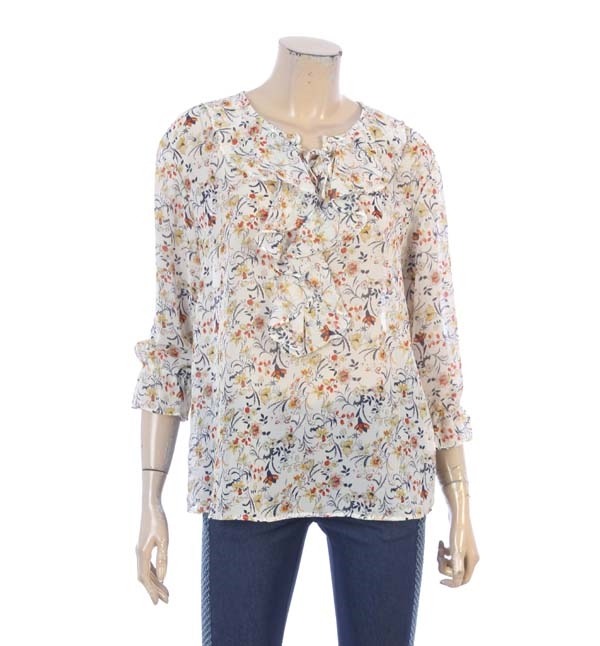 LYNN, 앞스트랩리본장식과 화려한 플라워 패턴이 돋보이는 여성스러운 느낌의 블라우스입니다