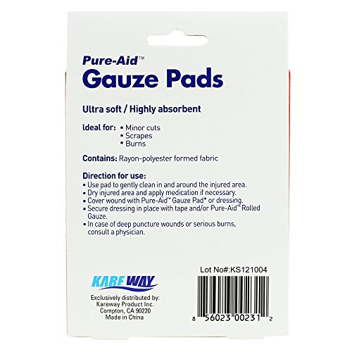 Studio : Kareway Publisher : Kareway Binding : Health and Beauty Product Description PURE-AID [Dressing Line] Gauze Pads 3" x 3" - 8cts ?For cleansing and covering wounds ?Ultra soft/Highly absorbent ?8 Sterile pads 3in x 3in ?2 Pack ?Ideal for →Minor cuts →Scrapes →Burns Direction for use ?Use pad to gently clean in and around the injured area. ?Dry injured area and apply medication if necessary. ?Cover wound with Pure-Aid Gauze Pad* or dressing. ?Secure dressing in place with tape and/or Pure-Aid Rolled Gauze. ?In case of deep puncture wounds or serious burns, consult a physician.