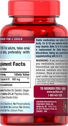 Coenzyme Q-10 (CoQ10) is a key antioxidant that can support you as you age gracefully. It plays numerous roles within the body such as supporting energy production and fighting off cell-damaging free radicals, which is what makes CoQ10 an important compound in your body.** CoQ10 contributes to cardiovascular wellness and energy production within your heart.** If you're looking to support a healthy heart and blood-pressure levels that are already within a normal range, CoQ10 does just that.**It also promotes oral and gum health which is also good for the heart.** Puritan's Pride's own Q-SORB CoQ10 is a natural, highly bioavailable form of CoQ10, and is manufactured in the United States with ingredients sourced from around the world. CoQ10 levels within cells may decline with age.** They may also be reduced in those who take statin medications, which are often prescribed for high cholesterol. Q-SORB CoQ10 can help replenish what statin medications deplete.++ Puritans Pride Q-SORB CoQ10 supplement contains 600mg of Coenzyme Q10 per softgel. This individual product contains 60 rapid release softgels. Each softgel is hermetically sealed and free of artificial flavors and sweeteners. They contain no preservatives, sugar, starch, milk, lactose, gluten, wheat, yeast, or fish. Adults are advised to take 1 softgel capsule per day, preferably with a meal. ** These statements have not been evaluated by the Food and Drug Administration. These products are not intended to diagnose, treat, cure or prevent any disease.Feature