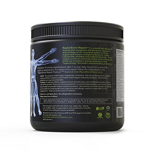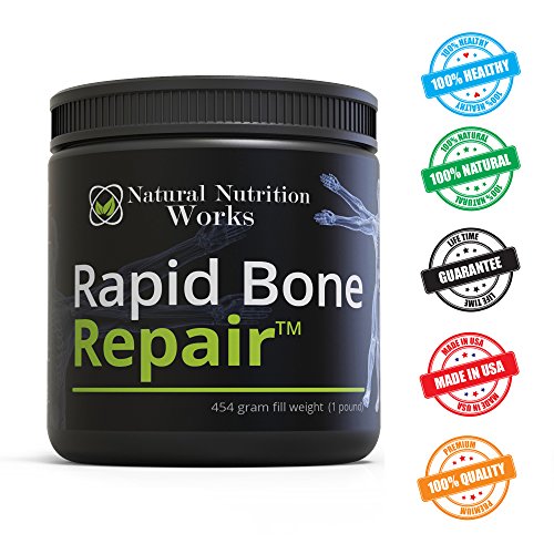-. Binding : Health and Beauty -. Brand : Natural Nutrition Works -. EAN : 0641061610717 -. Feature : +MOST BIO-AVAILABLE BONE SUPPLEMENT: OHC (Calcium) with Vitamins, Minerals, Amino Acids and other Co-Factors to SuperCharge your bone repair! / +NO SWEETENERS OR PRESERVATIVES: Unflavored, Unsweetend powder for use in Smoothies, AppleSauce or Yogurt. / +BONUS 48 PAGE "RAPID BONE REPAIR PROTOCOL": Included a free downloading of the 48 page report on how to DRAMATICALLY increase the speed of healing a fractured bone. Simple, Effective and Clear methodology that will get you back on your feet as quickly as possible. Clinical Studies and Research spelled out in a simple to understand format! This valuable book is also available in paperback or on Kindle. / +REJUVENATE AND RECOVER: Hydrolized Collagen is included to promote joint health, cartilage repair, hair growth, nail growth and to promote skin flexibility. Paleo Friendly. Perfect for maintaining Bone Health against Osteoperosis. / +RISK FREE GUARANTEE: Try out Rapid Bone Repair absolutely RISK FREE. We are so confident that you are getting the most bio-available bone supplement that we're giving a full 365 day guarantee. If you are not completely satisfied with your results or service, simply contact us and we will make it right for you. We at Natural Nutrition Works care about your results and want you to be successful. That why we stand behind our products. -. IsAdultProduct : 0 -. Label : Natural Nutrition Works -. Manufacturer : Natural Nutrition Works -. MPN : RBR454 -. PackageQuantity : 1 -. PartNumber : RBR454 -. ProductGroup : Health and Beauty -. ProductTypeName : HEALTH_PERSONAL_CARE -. Publisher : Natural Nutrition Works -. Size : 454 grams (1 pound) -. Studio : Natural Nutrition Works -. Title : Rapid Bone RepairTM- Natural Calcium & Mineral Bone Meal Powder Complex w/Magnesium, Vitamins K2, D3, B6, Amino Acids, Chitosan, Fulvic Acid, Collagen, Silica & more to dramatically speed up Recovery -. UPC : 641061610717
