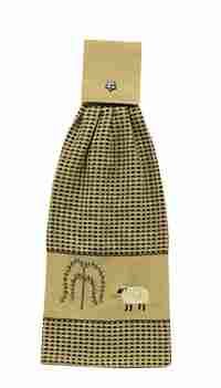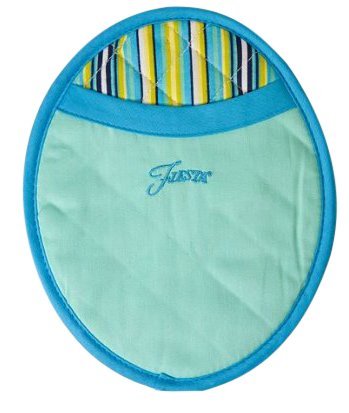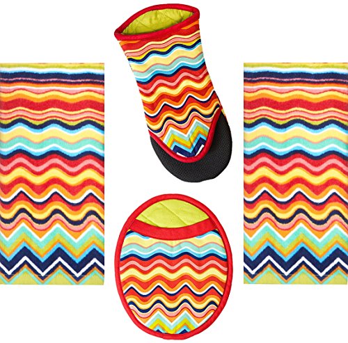 - Set of 2 colorful Fiesta zig zag kitchen towels, puppet oven mitt, and oval pocket mitt; all 100% cotton