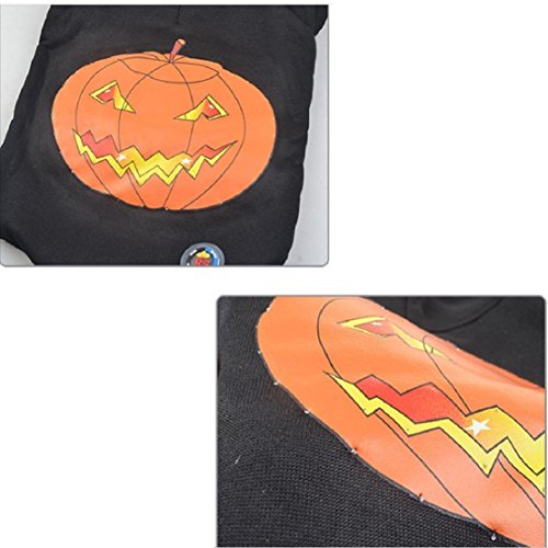 -. Feature : Material: Cotton / It will become luminous and shiny if dog move / It needs 2pcs 2032 button battery / Style:Funny and lovely, Sleeve Length:Short Sleeve / Decoration:Pumpkin and Ghost, Collar:Round neck