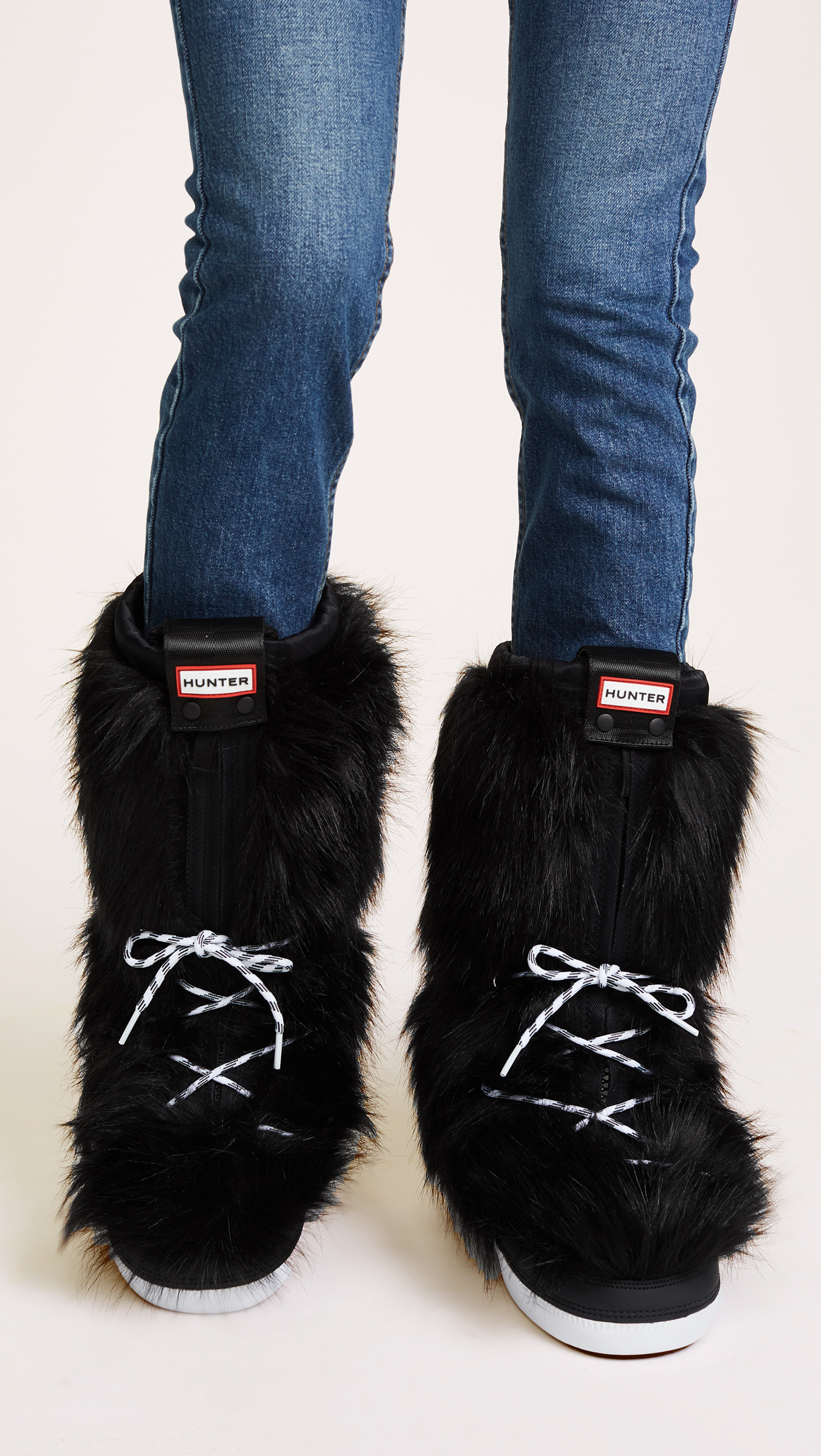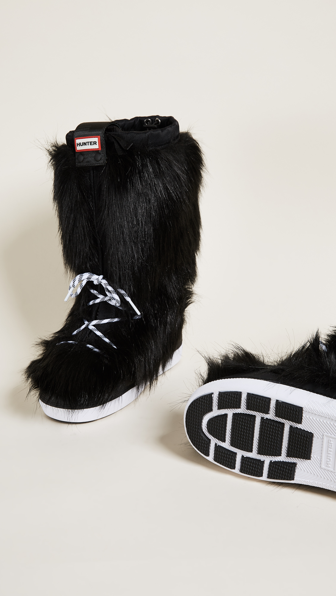 Faux-fur Hunter Boots snow boots finished with tonal rubber trim. A logo strap snaps over the hidden front zip and a toggle drawstring cinches the shaft. Lace-up closure. Rubber sole.