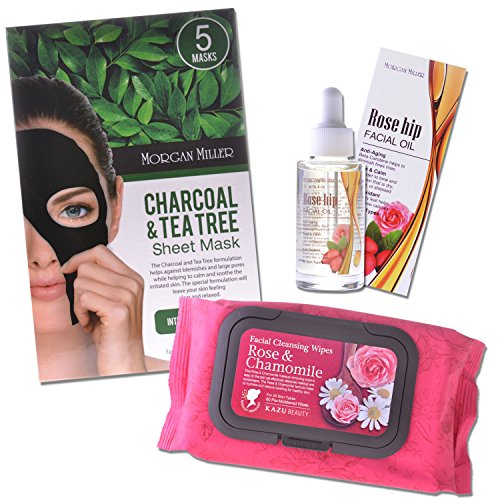 Rose & Chamomile Facial Cleansing Wipes, 60ct; Charcoal & Tea Tree Sheet Mask, 5ct; Rosehip Facial Oil, 1.01 fl oz
