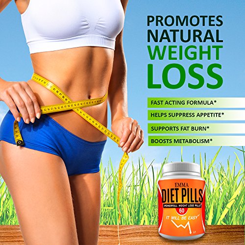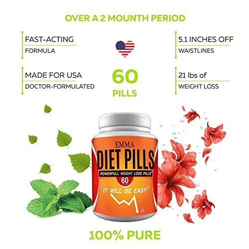 -. Binding : Health and Beauty -. Brand : Emma -. Feature : EFFECTIVE WEIGHT MANAGEMENT with powerful formula diet pills that combines natural herbal ingredients to support impressive weight loss. Watch the pounds melt away. / FAST WEIGHT LOSS is easy and predictable with these Emma Weight Loss Pills for Women and Men. Many of our customers report losing 20 pounds. / NO STARVATION DIETS or SWEATY EXERCISE. You've tried dieting before only to find yourself starving. These pills stop hunger urges, help you easily avoid fatty snacks between meals. / REDUCES FLUID RETENTION, helps cleanse toxins from your body, and burns fat at a higher rate. All this happens naturally with good-for-you herbs. This is the USA Made non-habit forming diet supplement that helps any man or woman easily and quickly lose pounds and drop inches. / 100% MONEY BACK GUARANTEE ensures this will quickly become your favorite no-risk purchase. Many people are stocking up with 2 or 3 bottles to continue their weight loss program for months of positive benefits. -. IsAdultProduct : 0 -. Label : EMMA -. Manufacturer : EMMA -. PackageQuantity : 60 -. ProductGroup : Health and Beauty -. ProductTypeName : HEALTH_PERSONAL_CARE -. Publisher : EMMA -. Studio : EMMA -. Title : Diet Pills - Weight Loss Pills for Women - Fat Burners for Men - Appetite Suppressant - Weight Loss Supplements - Weight Management Fat Burning Aid - Natural Weight Loss Pills That Work Fast 60 pills