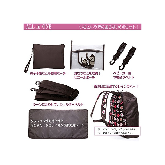 부속 : 소품용 파우치(20×15㎝)고, 젖음(정사/연애/호색)물 용방수 파우치(23×16㎝)고, 유모차용 매닮 벨트,숄더 벨트(76-133㎝)고, 기저귀 교환용 씨트(39×60㎝)고, 저판,레인 커버(레인 커버는,브라운 폴카와 진즈 그레이에는 부속 하지 않습니다) ※젖병,봉제인형은 부속하고 있지 않습니다.