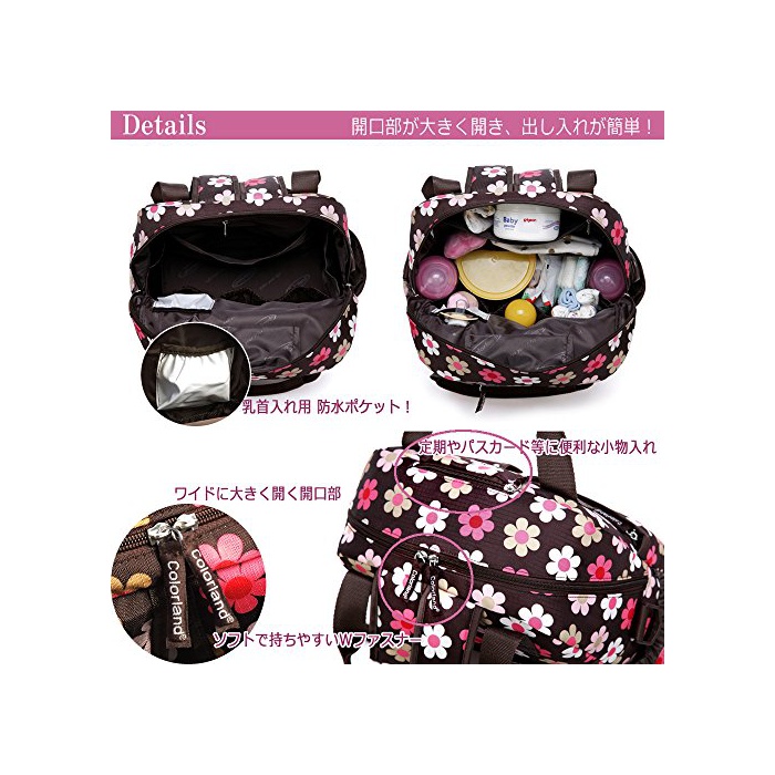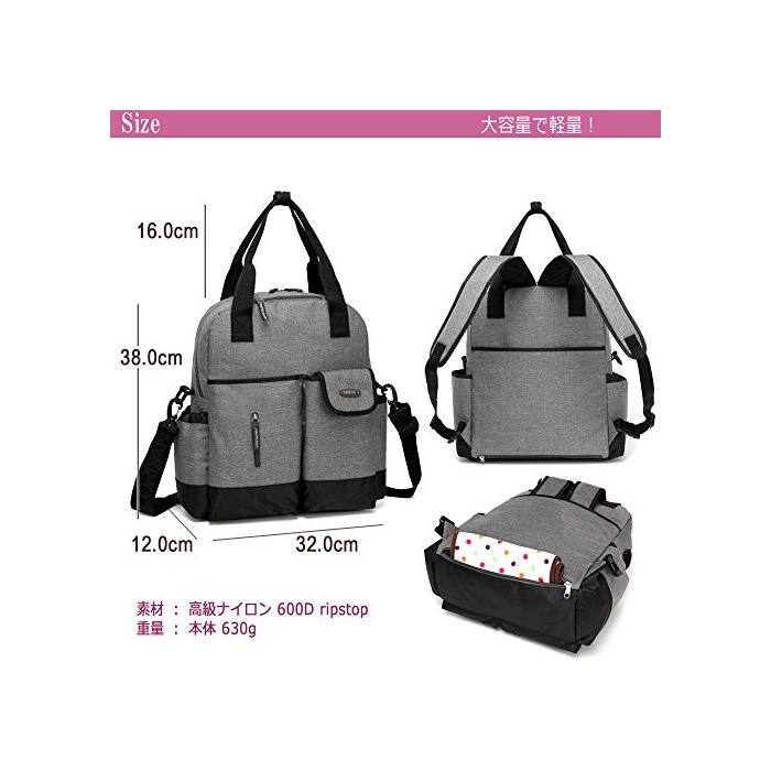 사양 : 메인 개폐 패스너 <외부 포켓>겉쪽 패스너 포켓(중)×1(티슈 꺼내어 패스너 부착)고, 벨크로 플랩 포켓(중)×1(키 체인 첨부 와)고, 싸이드 오픈 포켓×2(하나는 보온 기능 있어)고, 메인 패스너 옆에 패스너 부착 포켓(소)×1 뒤편 오픈(벨크로 유치 대)×1,저부에 패스너 포켓×1 <내부 포켓>오픈(대)×1,패스너(중)×1,싸이드 포켓×2,망고무 포켓(소)×3,방수 젖병 유두용 포켓(소)×1