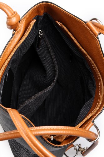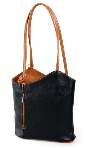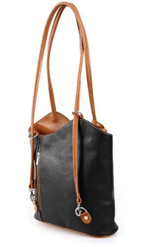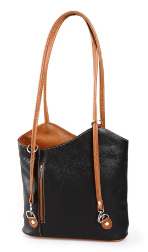 IO.IO.MIO Borsetta per le Icone elegante Leder Handtasche Schultertasche Rucksack 2in1 Handtasche schwarz cognac , 27-32x30x9 cm (B x H x T)