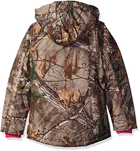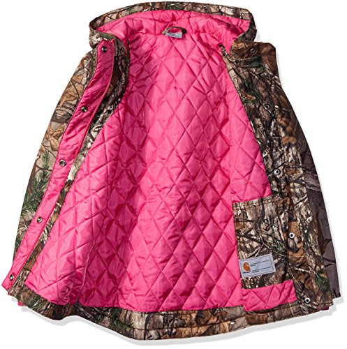 Water and wind resistant full zip hooded real tree extra printed jacet. Extended zip through neck closure and internal storm falp secured with hidden snaps and zipper to block out cold. Triple stitched main seams for added durability. Front seams eith hidden left chest pocket eith media ports. Hidden sleeve cuffs and front pockets. Contrast pink quilted taffeta lining in body and sleeves provide warmth and five east of movement. Weather-shelilding drop tail hem for a flattering fit. Internal pocket with name tag label for extra storage. Carhartt woven brand mark label on front hem.Feature