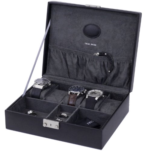 Eliminate clutter with this Tech Swiss leather valet case. This leather valet lid lifts to provides multiple compartments lined in fabric to hold other accessories such as watches, earrings, necklaces, rings, cufflinks and much more. The case features silver plated hardware and comes with a lock and key. Great Gift Idea!