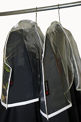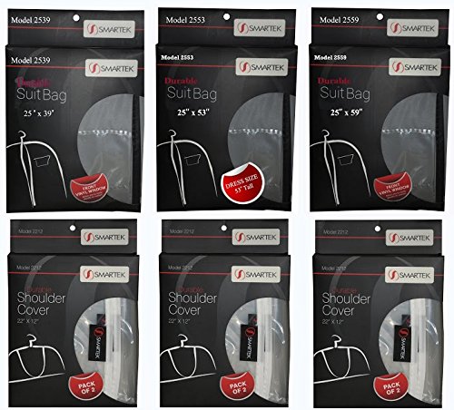 -. Feature : Keeps your garments fresh and clean and your closet organized / Polyethylene material Durable Shoulder covers set of 6 / Durable Zippered Garment bags set of 3 Assorted Sizes / #2539 Suit Bag Measures 25"x 39" , #2553 Dress Bag Measures 25" x 53" / #2559 Gown Bag Measures 25"x 59", #2212 Shoulder Cover Measures 22"x 12"