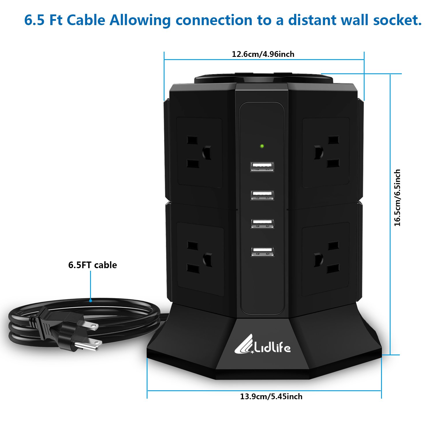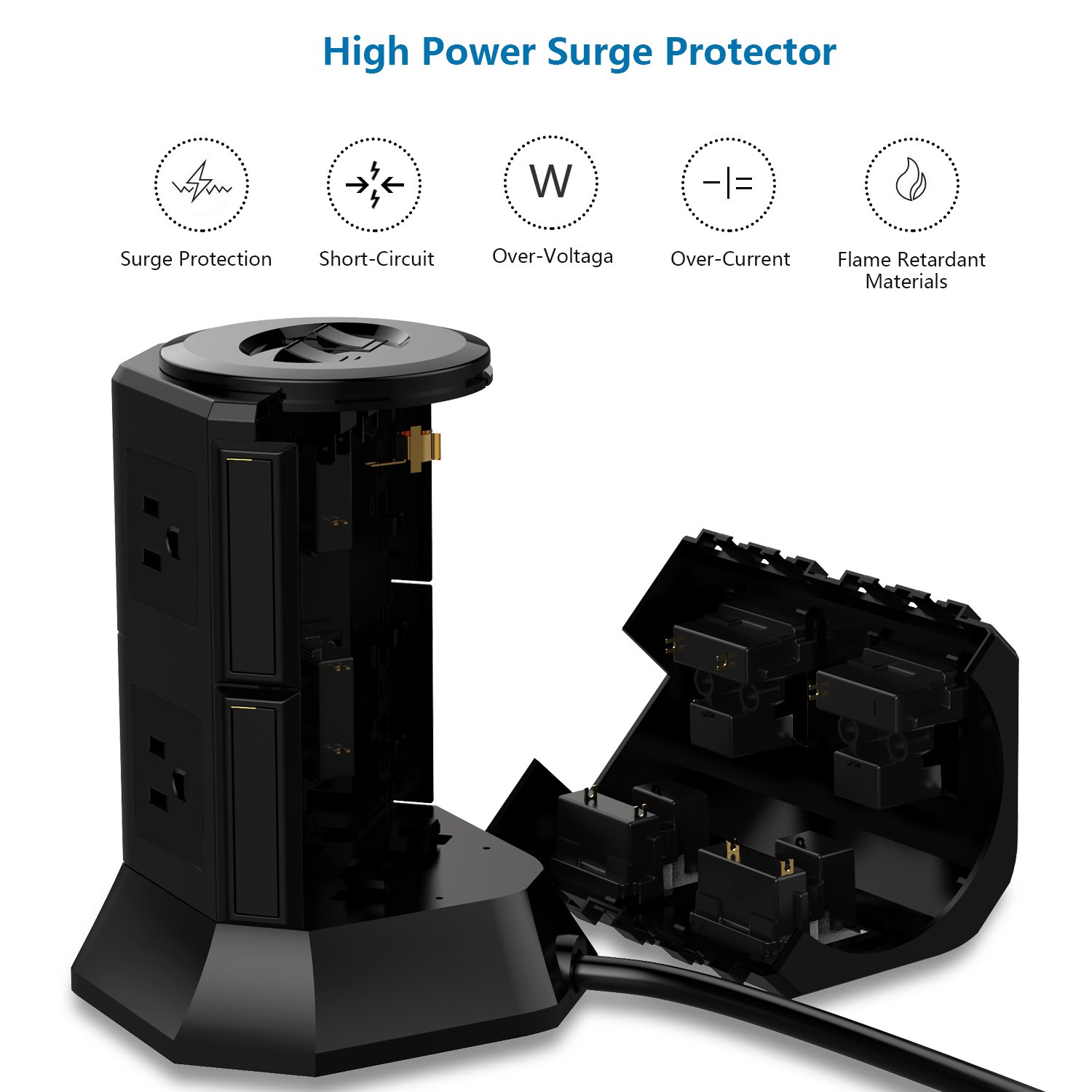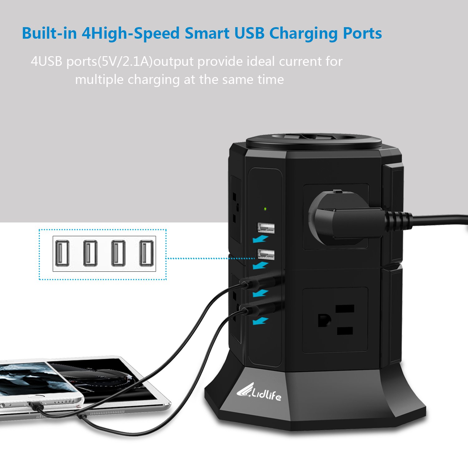 Power supply tap tower type receptacle 8 pieces mouth AC outlet 4 USB port fast charge possible lightning protection guard protection overload protection energy saving