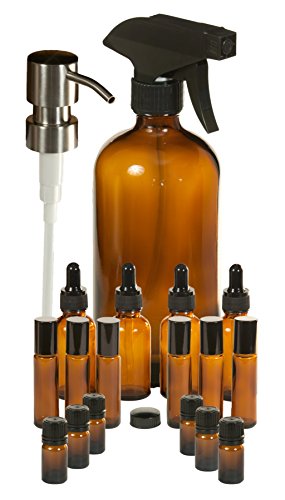 - INCLUDES: 1 - 16 oz glass amber spray bottle with poly cap, spray nozzle and hand pump, 4 - 30ml dropper bottles, 6 - 10ml roller bottles, 6 - 5ml euro bottles