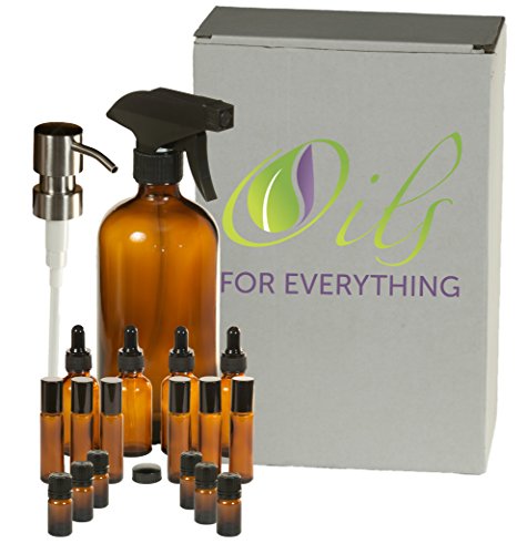 ESSENTIAL OILS COMPLETE DIY KIT Includes 16 oz Glass Amber Bottle with Poly Cap, Spray Nozzle & Stainless Steel Hand Pump, 6 - 5ml Euro Bottles, 6 -...