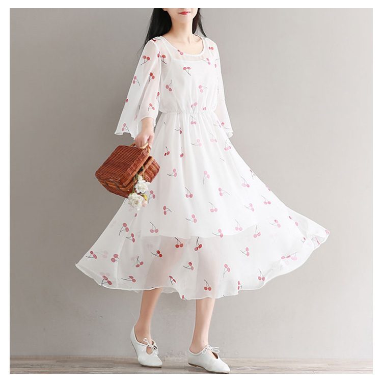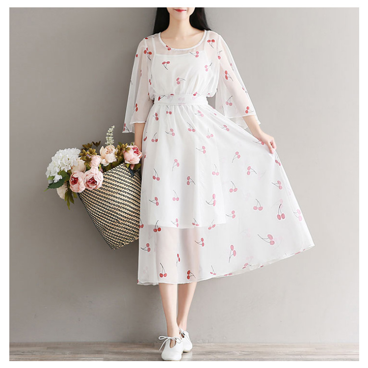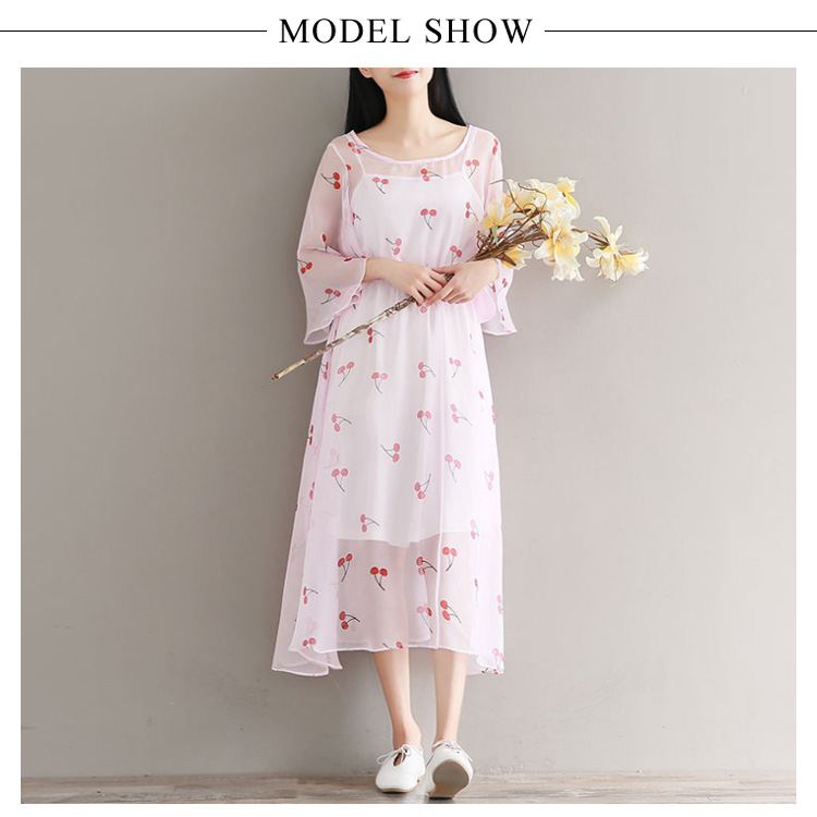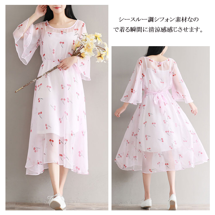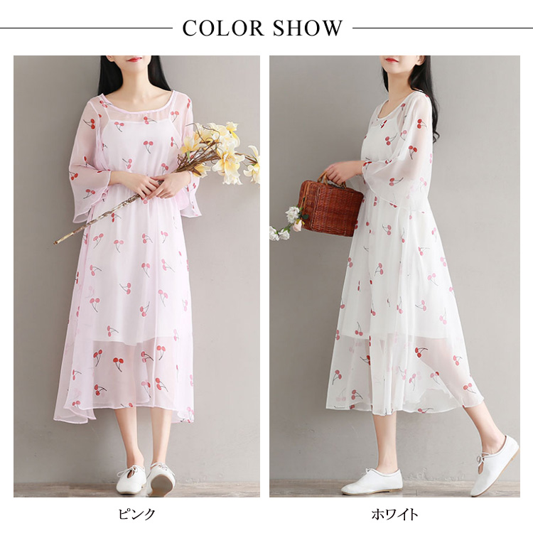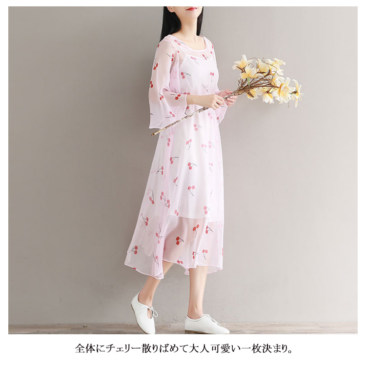 | 大カワイイチェリー柄ワンピース。全体にチェリー散りばめて大人可愛い一枚決まり。シースルー調シフォン素材なので着る瞬間に清涼感感じさせます。膝にかかる丈感も穿きやすい、インナーキャミ付きも嬉しい。春夏にぜひオススメな一枚です。 | |