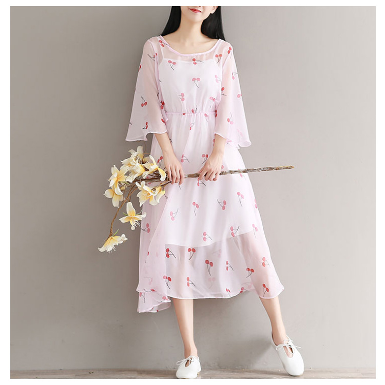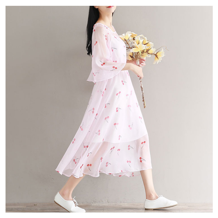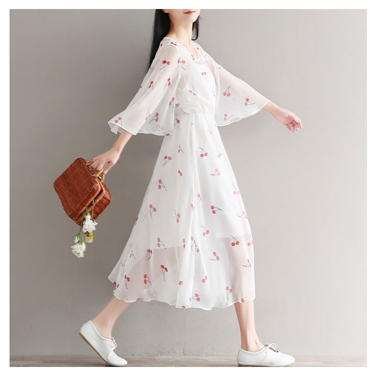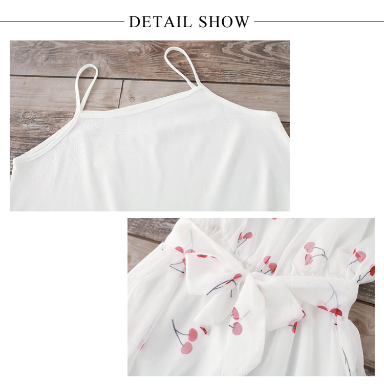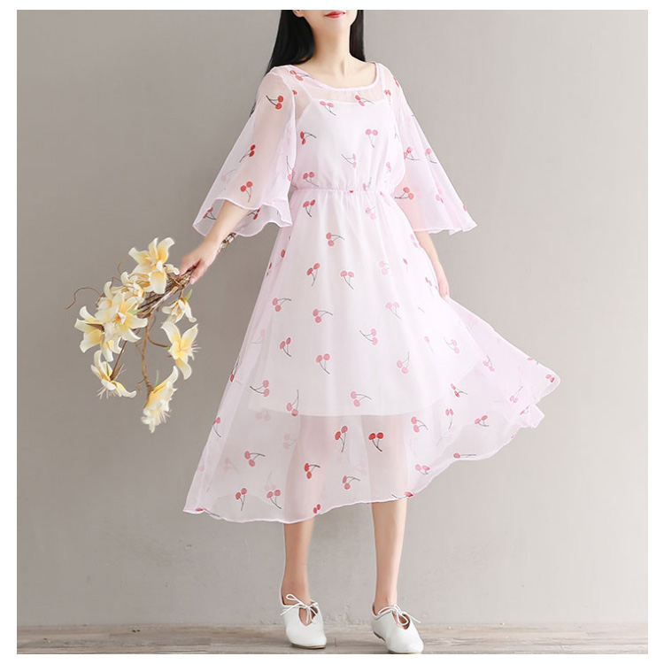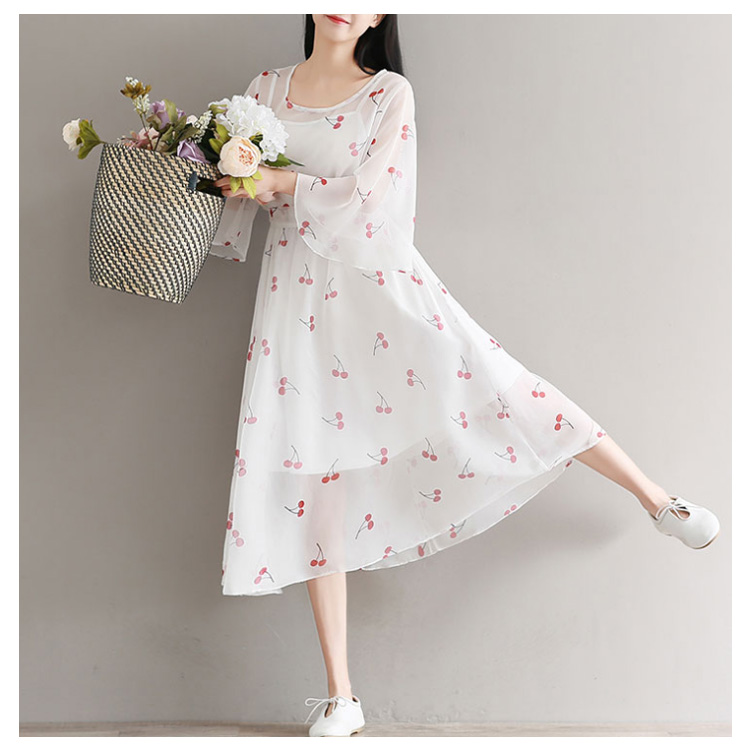 | 大カワイイチェリー柄ワンピース。全体にチェリー散りばめて大人可愛い一枚決まり。シースルー調シフォン素材なので着る瞬間に清涼感感じさせます。膝にかかる丈感も穿きやすい、インナーキャミ付きも嬉しい。春夏にぜひオススメな一枚です。 | |