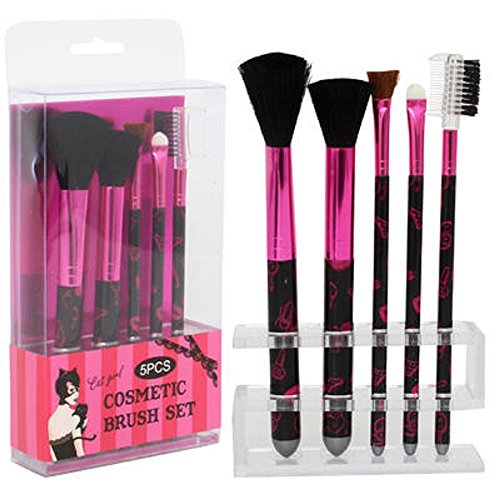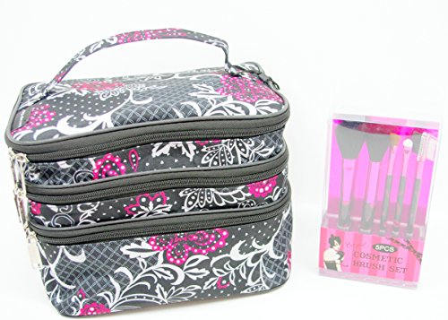Includes: An adorable Black & Hot Pink Butterfly on Paisley 3 Tiered Zippered Cosmetic/Travel Bag with Mirror & 5-Piece Makeup Brush Set with Clear Acrylic Holder