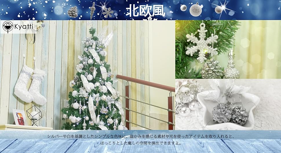 ▶Kyattiではシルバー&白を基調としたシンプルで北欧テイストのオリジナルのクリスマスオーナメントセットをご用意しています。