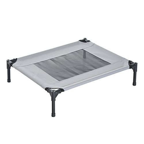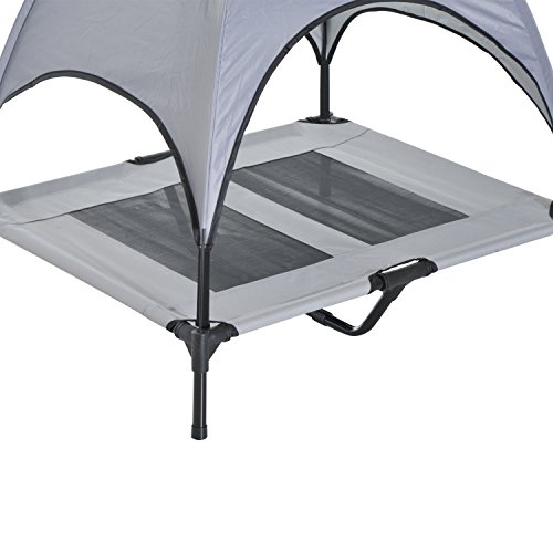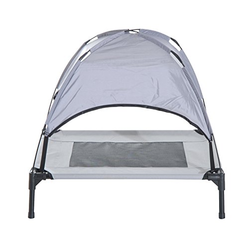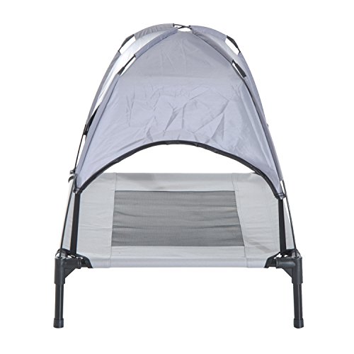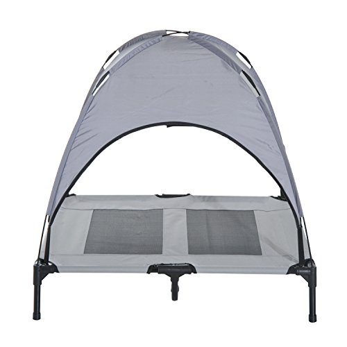 -. Binding : Misc. -. Brand : Pawhut -. Color : Grey -. Feature : ✔ ELEVATED AIRFLOW: An elevated, cot-style design lifts your pet more than 7 inches off of the ground which allows air to flow freely on all sides and underneath. / ✔ BREATHABLE FABRIC: The bed's durable mesh fabric adds breathability to help keep your pet cool, which is especially important during those hot summer months. / ✔ DURABLE DESIGN: The mesh fabric is held tightly in place by a lightweight yet strong powder-coated steel frame with four stable feet that ensure safe and level placement that won't tip over. / ✔ CANOPY TOP: An included canopy top provides shade to your pet and shields them from the sun on hot summer days. A simple design means all you have to do is plug the canopy into the corners of the cot and secure it with the bungee cords. / ✔ PORTABLE STYLE: With a lightweight, portable folding design and included travel bag for simple storage, it's easy to take our cot with you anywhere you go. -. Label : Pawhut -. Manufacturer : Pawhut -. PackageQuantity : 1 -. ProductGroup : Pet Products -. ProductTypeName : PET_SUPPLIES -. Publisher : Pawhut -. Studio : Pawhut -. Title : Pawhut Elevated Cooling Dog Bed Cot w/ Canopy Shade - Gray