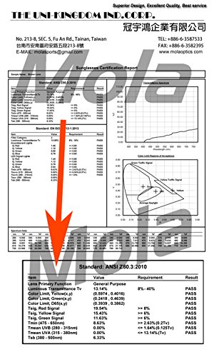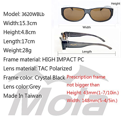 Product Description MOLA Suncover polarized sunglasses are the famous brand in Taiwan. MOLA Polarized sunglasses fit over prescription glasses clip on UV400-3620Wblb Frame color :Crystal Black Lens color : Brown Head Size: Medium (fits adult face) MOLA polarized sunglasses fit over glasses uses polarized lens to block 100% of ultraviolet rays. Comfortably fit over most small to medium sized prescription glasses. MOLA polarized lens is scratch resistant Ultra Lightweight Case and Cloth Included Made in Taiwan All of MOLA polarized sunglasses meet with US ANSI Z80.3 AND EU ISO 12312-1:2013 Standard. 0