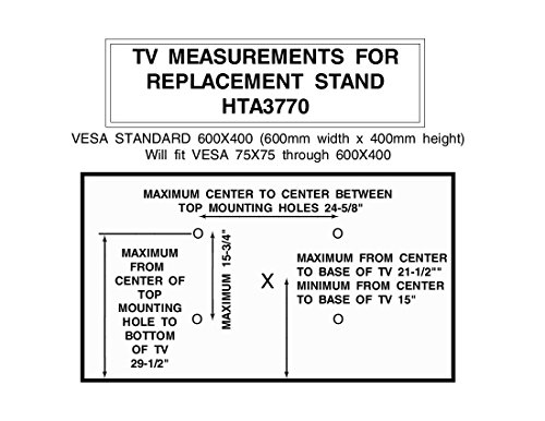 -. Feature : PLEASE CAREFULLY CHECK your TVs mounting hole pattern and TV weight. This mount will work with VESA patterns up to 600x400 (600mm X 400mm). (Horizontal measure 24-5/8" x vertical measure 15-3/4") Maximum weight 70 lbs (31.75kg). Please note: you need to carefully check your TVs mounting holes before purchase. If your TV is not compatible and the stand is ordered in error there will be a restocking fee on any returns. / Fits MOST TVs from 37" - 70" and is compatible with thousands of models and brand Flat Panel TV. Simple Assembly and Installation. / Replaces lost TV stands/bases for most brands / Works with MOST OF the following brands: Akai, Apex, Coby, Curtis, Dynex, Element, Emerson, Funai, GE, Goldstar, Haier, Hisense, Hitachi, Insignia, JVC, LG, Magnavox, Maxent, Mitsubishi, Olevia, Panasonic, Philips, Pioneer, Polaroid, Proscan, Protron, RCA, Samsung, Sansui, Sanyo, Sceptre, Seiki, Sharp, Sony, Sylvania, Symphonic, TCL, Toshiba, Viore, Vizio, Westinghouse, Zenith & more!
