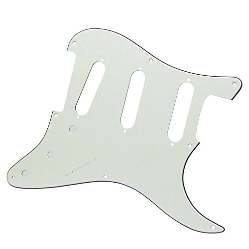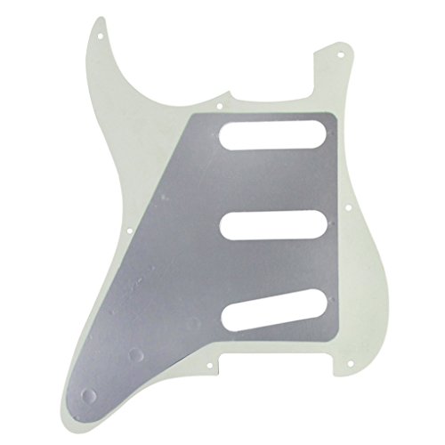 Product Description Feature: * Fits for Most US Vintage 8 Holes Fender Style Strat Style/ 50s ST Style Guitar Parts.* With pure aluminum foil shield on the backside, not the common aluminum-foil paper on the market, better shielding property and anti-interference.* All materials are environmentally friendly, thermostability, no smell. Multi-layer plates are pressed under high temperature and pressures, to make them close integration between each layer, will not appear curly, deformation, or separation of different layers.* Excellent product process ensure the edge of the smooth and structured.Two layers of protective films on the front of pickguards, anti-scratch to protect the guitar.Specification:* Style: SSS(single/single/single coil) style pickguard; 8 screws holes in the side of pickguard. 6 holes in the side of backplate* Material: Pickguard made of 3Ply PVC* Color: Ivory White Color*Size: as the size pictures shown. (please allow 1-2 mm error due to manual measurement.)*With protective film on the surface, while using please split it off.Note:item's color might be different from the picture because of the aberration.Package Includes:1 x guitar pickguard1 x back plate25 x pickguard screws 0