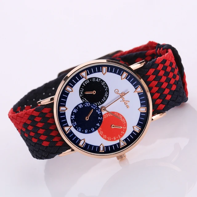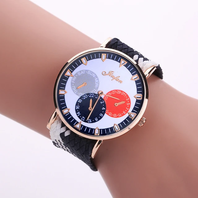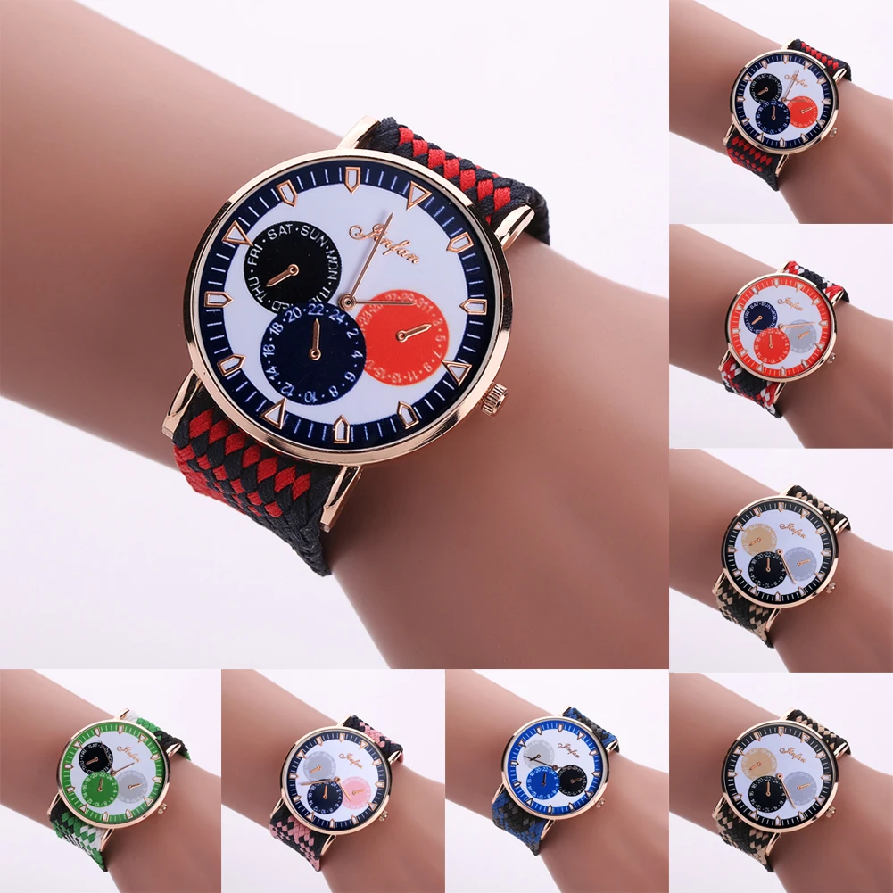 새로운 2017 여성 꼰 로프 팔찌 시계 여성 드레스 시계 패션 골드 다이얼 세 눈 캐주얼 석영 손목