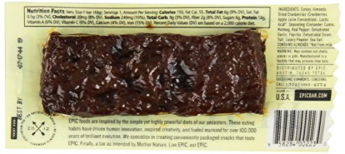 -. Feature : 3 Bison Bacon Cranberry, 3 Beef Habanero Cherry, 3 Lamb Currant Mint, 3 Turkey Almond Cranberry / The EPIC bar is a 100% grass fed animal based protein bar / Nutrient Dense- Gluten Free, Soy Free and Dairy Free / Total Fat: [lamb] 8 g, [turkey] 6 g, [beef] 11 g, [bison] 12 g / Cholesterol: [lamb] 25 mg, [turkey] 20 mg, [beef] 30 mg, [bison] 30 mg