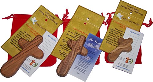 Three Olive wood Comfort handheld Crosses with Velvet bags & Lord's Prayer cards - set of three sizes