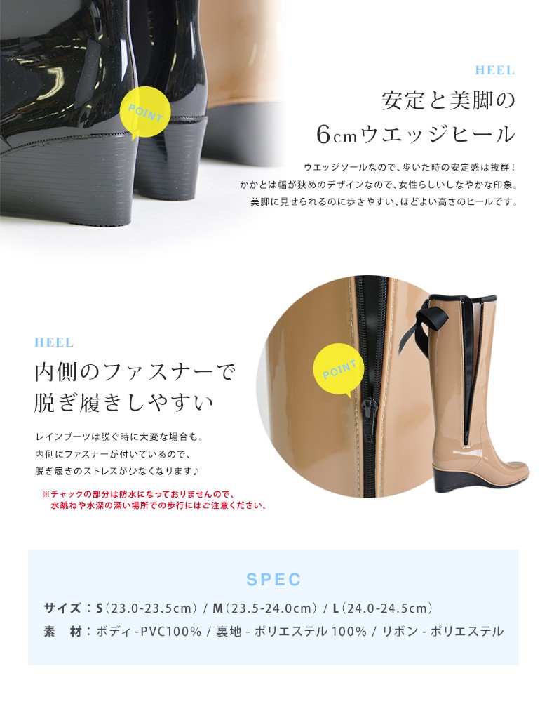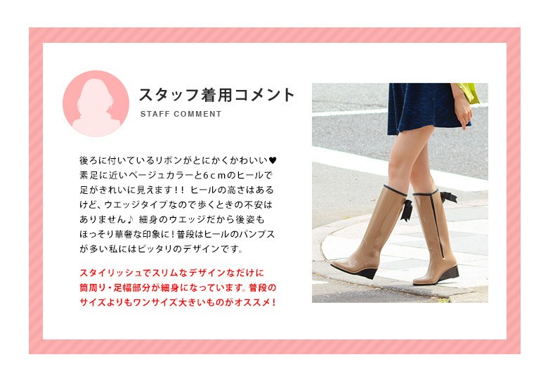 | 商品詳細 | コーディネートをぐっと大人っぽい雰囲気にしてくれる落ち着いたカラーのレインブーツが登場!雨の日だってオシャレしたい!そんな女の子のワガママを叶えてくれるレインブーツ♪美脚効果もGETできちゃうウェッジtypeが登場しました★歩きやすいのに脚長に見せてくれるウェッジ×ロング丈♪BACKにはリボンをキュッと結んで可愛さも忘れずにアピール☆内側にはジップ付きで着脱も簡単◎大人っぽいシックなカラーなのでコーデに馴染みやすく、『大人可愛い』Styleに♪梅雨や台風シーズンにも大活躍間違いナシ! スタイリッシュでスリムなデザインだけに筒周り・足幅部分が細身になっています。普段はいているサイズよりもワンサイズ大きいものがスタッフのオススメ!ブーツの筒周りとご自身のふくらはぎの周囲を比較してお買い求めください! | ||