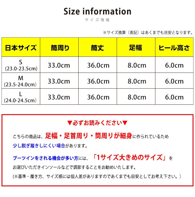 | 仕様 | ●S(23.0-23.5cm) 全長:42cm 高さ:36cm ヒールの高さ:6cm 筒周り(内寸):33cm アウトソール:22cm 足幅:8cm 重量:750g ●M(23.5-24.0cm) 全長:42cm 高さ:36cm ヒールの高さ:6cm 筒周り(内寸):33cm アウトソール:23cm 足幅:8cm 重量:750g ●L(24.0-24.5cm) 全長:42cm 高さ:36cm ヒールの高さ:6cm 筒周り(内寸):33cm アウトソール:23.5cm 足幅:8cm 重量:750g ※脱ぎ履きしやすいようにサイドにファスナー付き! ※サイドファスナー部分は防水にはなっておりませんので、水跳ねなどにはご注意ください。 ※こちらは足幅・ふくらはぎ部分(筒周り)が細身にできております。 | ||