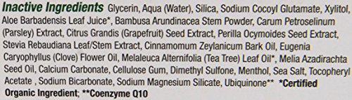 -. Feature : Anti-Cavity and tartar control toothpaste helps defend the mouth from bacterial growth that could lead to tartar build-up, periodontal disease and tooth decay / Tea tree oil and cinnamon flavored gel toothpaste with tea tree oil and fluoride / Contains natural and/or organic ingredients / No animal testing; kosher-certified / No: sodium lauryl/laureth sulfates, gluten, preservatives, artificial colors, artificial sweeteners or propylene glycol