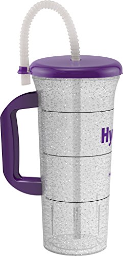 Hydr-8 Purple BPA Free 32 ounce Travel Water Bottle. Hydr-8 mugs provides a convenient way of tracking your daily water intake. They are marked with short term goals for you to reach in order to achieve your daily goal of 8 cups of water consumption. The Hydr-8 travel mug is visually divided into two hour increments. At each time marker, you should have consumed at least 8 ounces more of water. If you get a little behind? No big deal. It's easy to catch up. Half way through your day (by 2:00), you should fill up your water bottle for a second time. Keep meeting your hourly goals and by the end of the day, you will have consumed 64 ounces of water in addition to your normal dietary intake of fluids! Mission Accomplished. Now, don't you feel better?