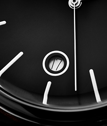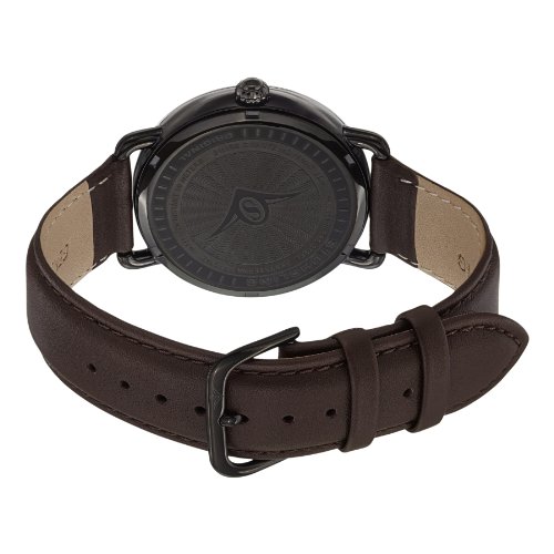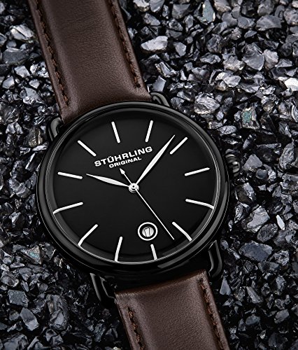 The polished stainless steel crown and bezel add classic appeal to this Stuhrling Original timepiece while the black minimalist dial lends a touch of modernity. Swiss Quartz movement with analog display Protective Krysterna crystal dial window Design features black dial with applied stainless steel markers, brown leather strap, stainless steel buckle clasp, and date window Water-resistant to 50 m (165 feet)Feature