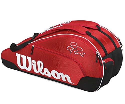 Wilson Federer Team III 6-Pack Red Tennis Bag. The Wilson Federer Team III 6-Pack Red Tennis Bag is the perfect choice for serious players looking to take their game to the next level. Holds up to 6 rackets. Features large and small accessory pockets, and a large compartment. Dimensions: 29.92 x 11 x 12.59 in. MFG#: WRZ833606.