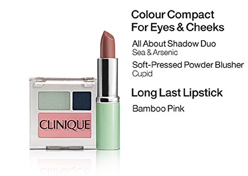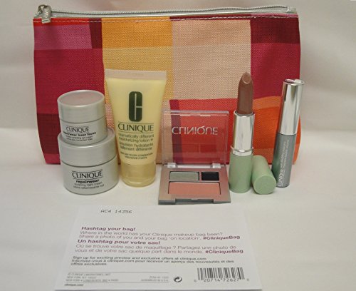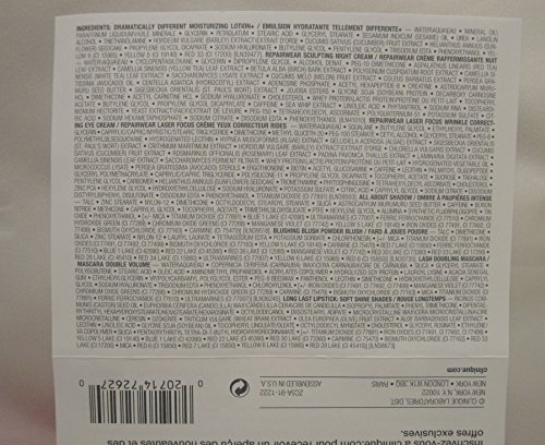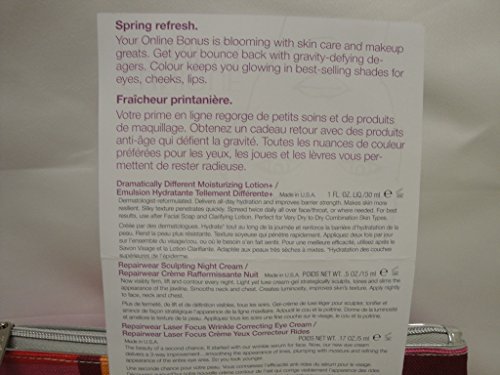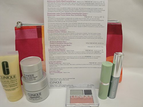 -. Feature : Dramatically Different Moisturizing Lotion+ 1oz/30ml / Repairwear Sculpting Night Cream 0.5oz/15ml + Repairwear Laser Focus Wringkle Correcting Eye Cream 0.17oz/5 / Clinique Color Compact 0.03oz/1g All about shadow duo in 09 Smoke and Mirror , 08 Wave after wave + Blushing Blush in 08 Cupid / Lash Doubling Mascara 0.14oz/3.4ml + Long Last Lipstick in Bamboo Pink 0.14oz/4g / a Cosmetics Bag