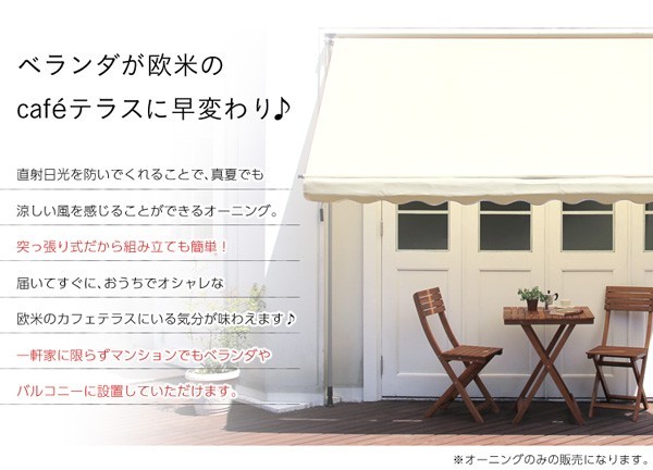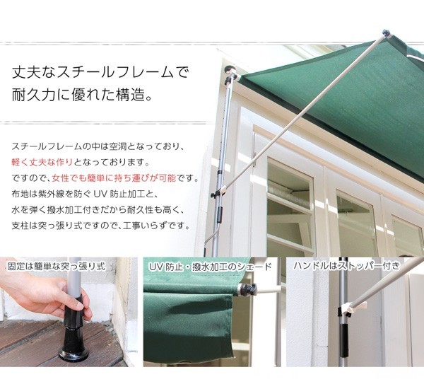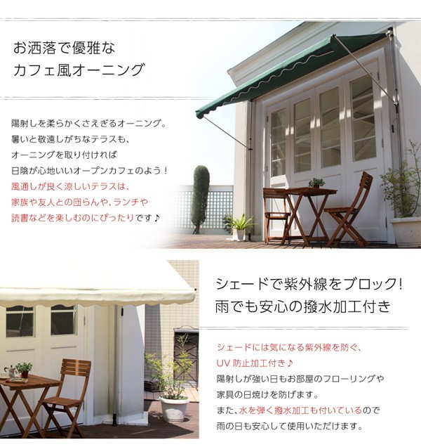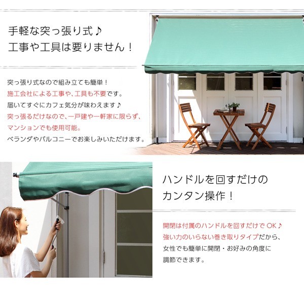【商品について】陽射しを防いで室内まで涼しく【タンゴ-TANGO-】(オーニング3M 日よけ)■サイズ:外寸:(約)幅300x奥行き130x高さ200~300cm※商品重量:(約)12kg■カラー:グリーン アイボリー■素材:ポリエステル、スチール■その他:・お客様組立商品です・梱包サイズ:(約)14x313x11cm(1.7才)・梱包重量:(約)14kg・ 開閉は必ず周囲に障害物がない事を確認してから行なってください。・ 強風・大雨・降雪時、または予想される時や、夜間、留守にする場合などは必ずシェードを巻き取ってください。