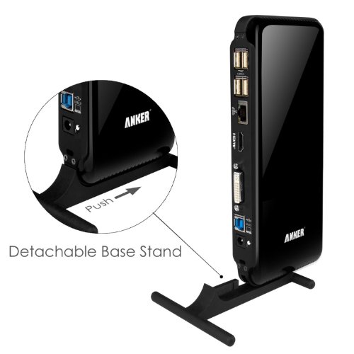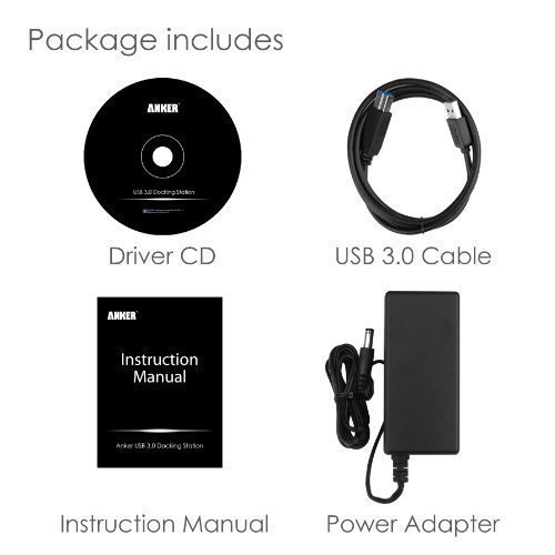 Package includes: Anker USB 3.0 Docking Station, detachable base stand, 19V 2A AC power adapter, USB 3.0 cable, driver CD, user manual, quick installation guide.