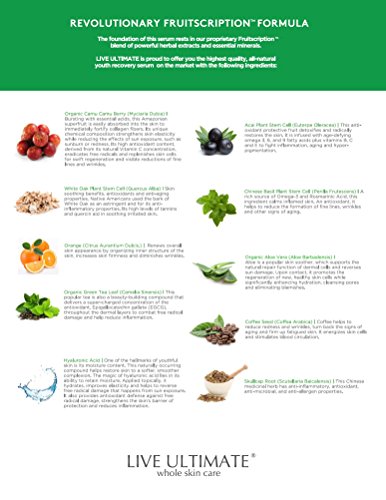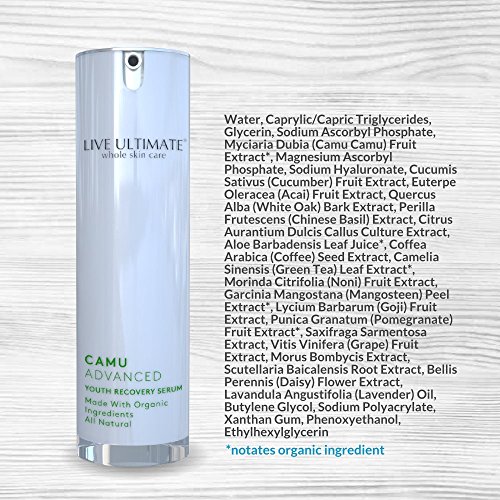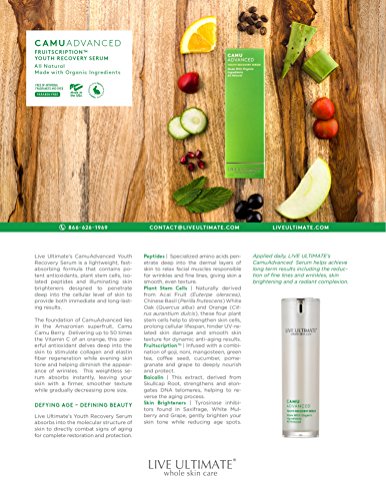 Live Ultimate's CamuAdvanced Youth Recovery Serum gets its power from the exotic Camu Camu Berry, which delivers 50 times the vitamin C to your skin as vitamin C creams based on oranges. And while other creams contain harmful, chemical additives that are absorbed into the body, our proprietary formulation contains only ingredients that have been certified safe by the Environmental Working Group's SkinDeep cosmetics database, ensuring maximum results without the risk of other commercial products. Never greasy and never filmy, CamuAdvanced delivers instant, natural results with products designed by Mother Nature.